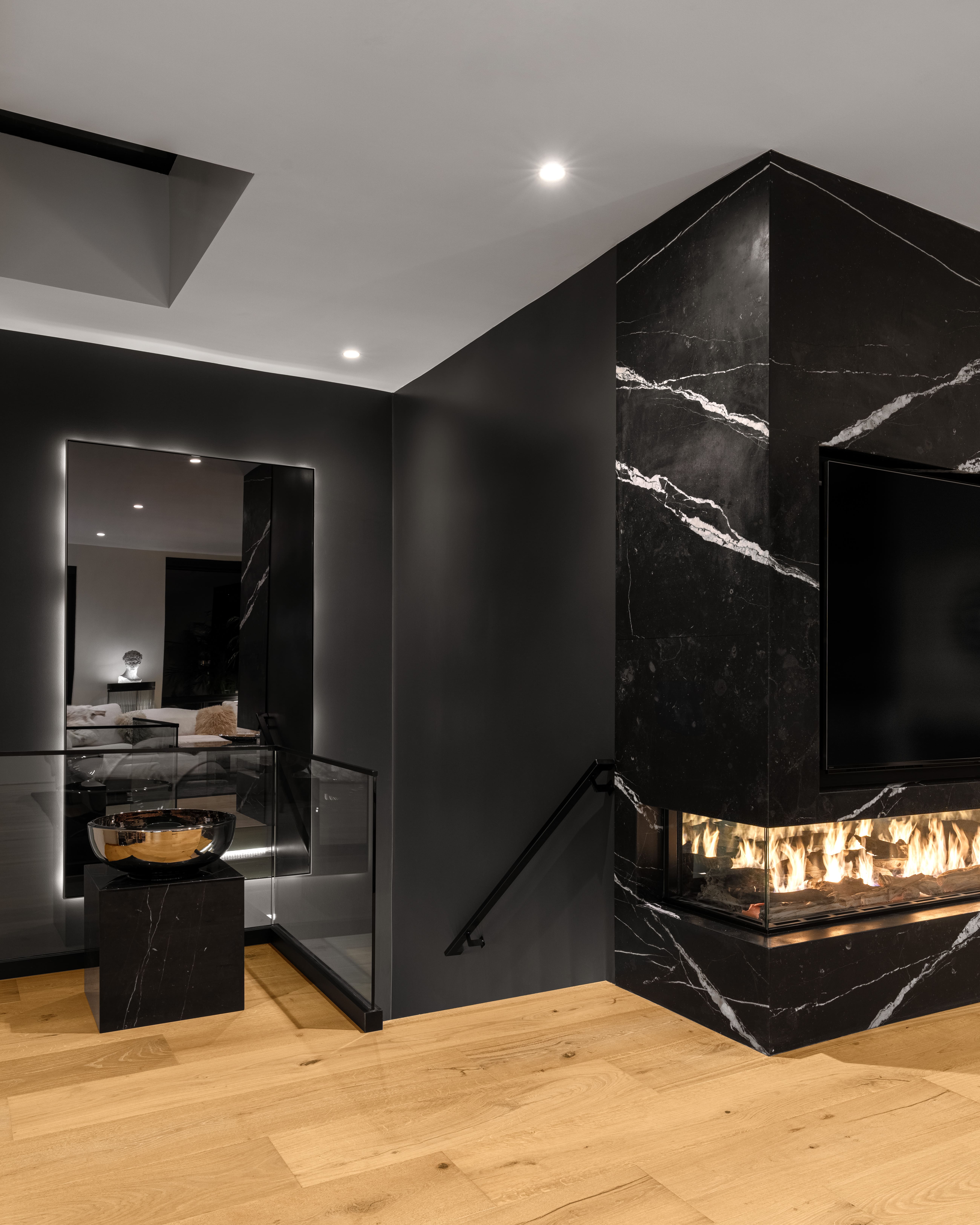 Major statements were the name of the game, featuring an ultra-modern German Eggersman kitchen with an illuminated stone peninsula and brushed stainless steel counters, a dramatic custom black stone fireplace, a solid rock headboard feature wall in the main bedroom, and an unapologetically moody bathroom with black stone walls.