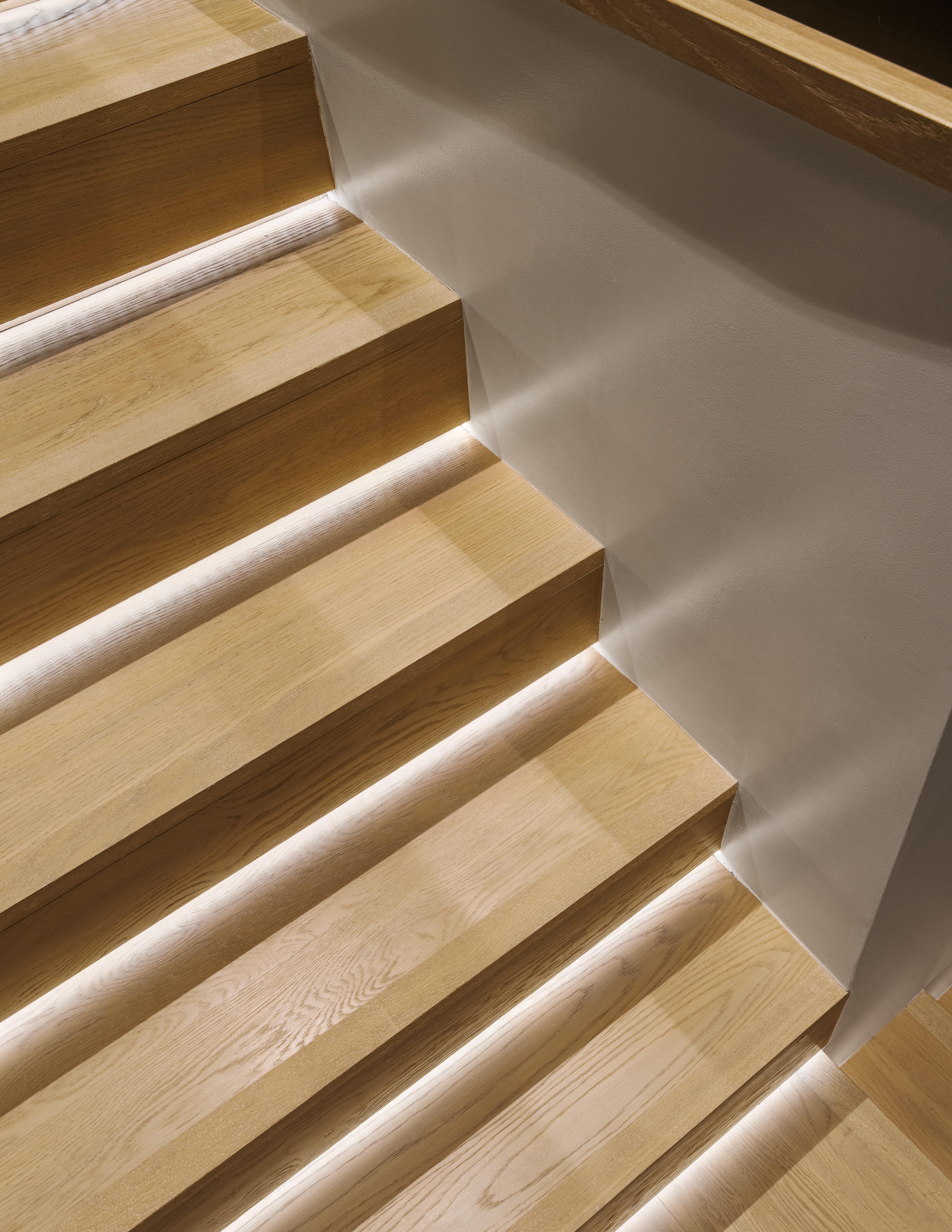 Soft sheer drapes, strategic lighting and white oak floors infused warmth into the space, creating the ultimate luxury urban living experience.